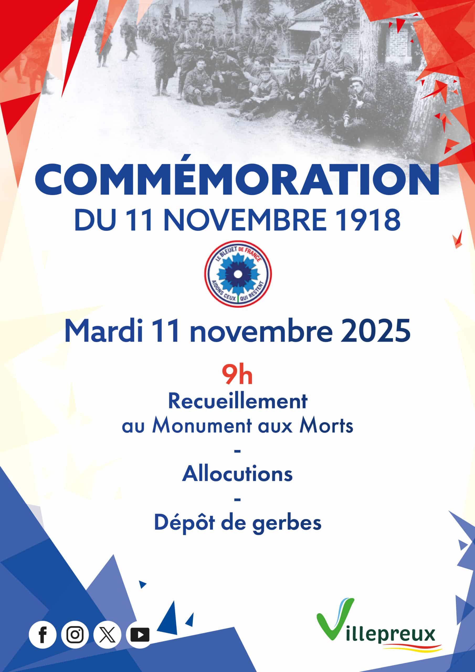 La Ville de Villepreux vous donne rendez-vous mardi 11 novembre à 9h au monument aux morts pour un moment de recueillement et de mémoire.