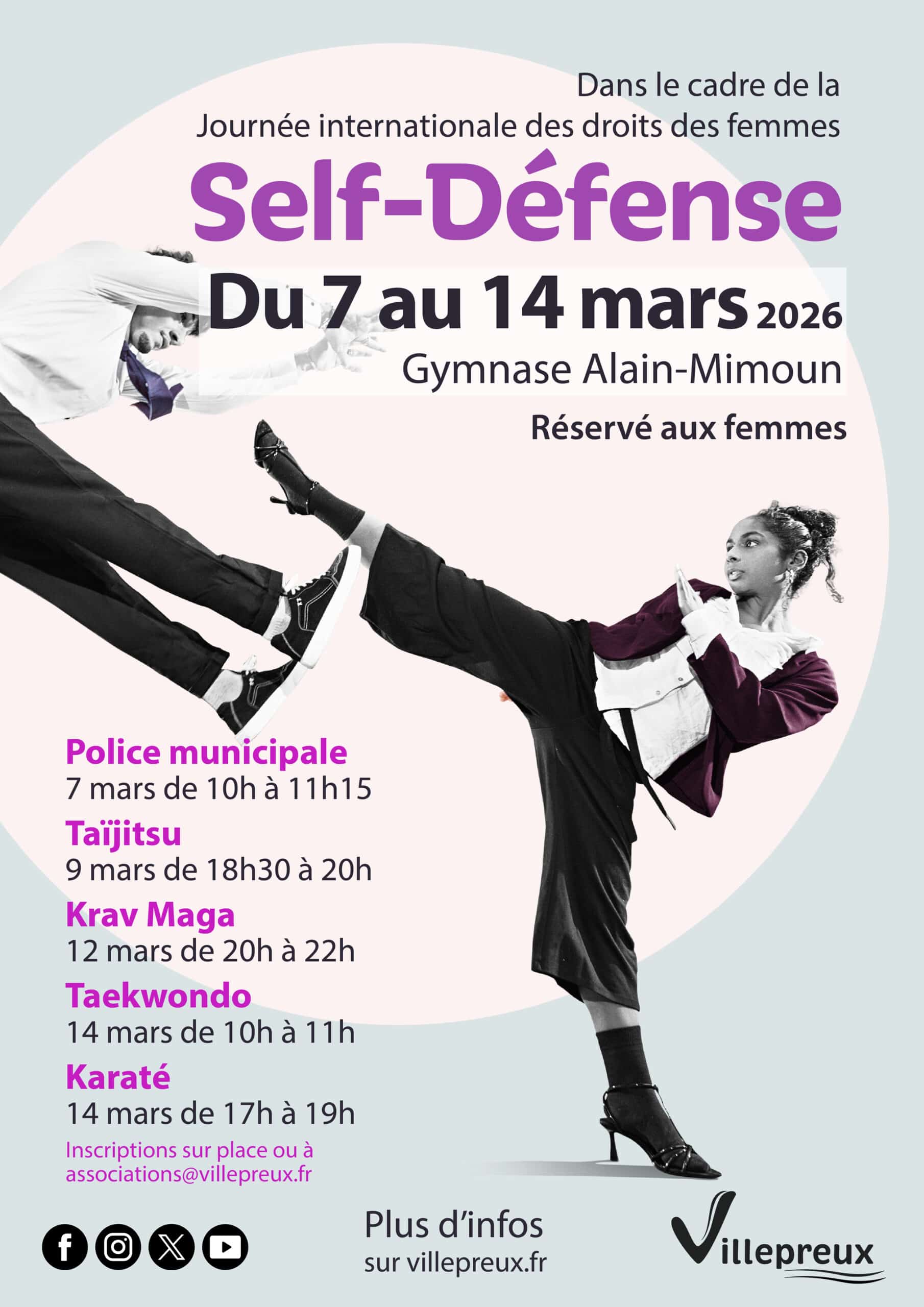 Dans le cadre de la Journée internationale des droits des femmes, la Ville de Villepreux organise une semaine dédiée au self-défense, du 7 au 14 mars 2026, au gymnase Alain-Mimoun.